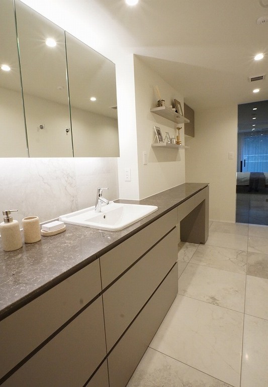 ・洗面化粧台造作…W3496/3面鏡/フィオレストーン(天板) ・床暖房新規交換(LD)