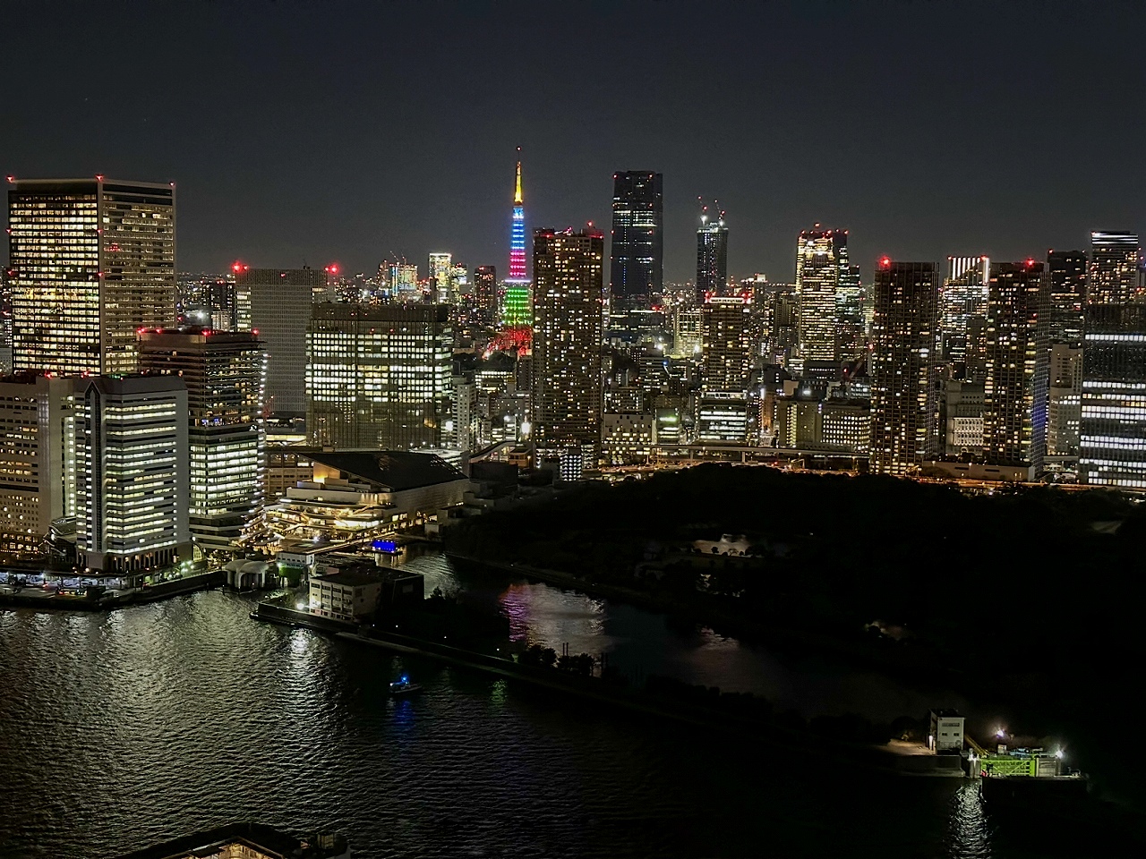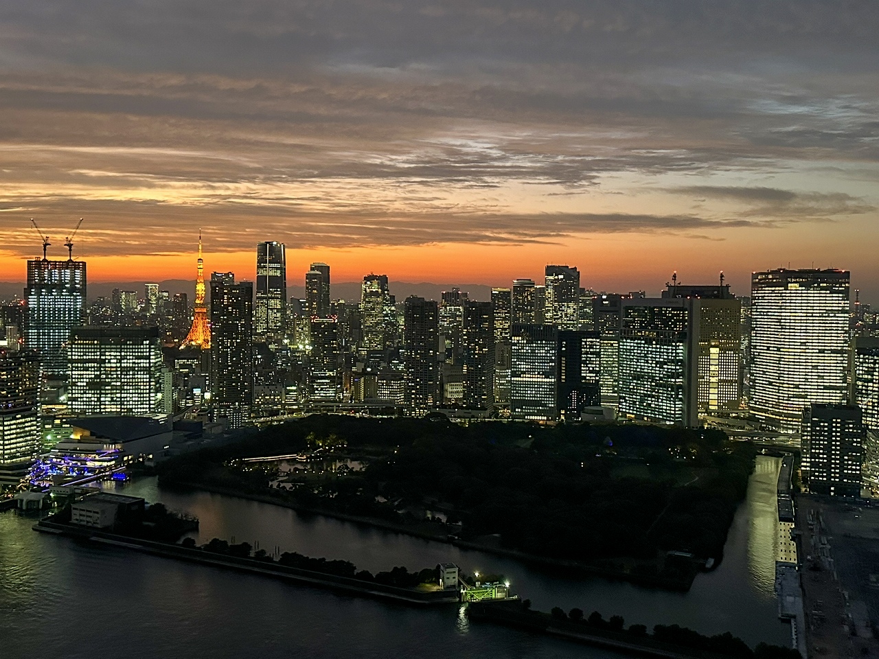 リビングからは隅田川・スカイツリー方面、バルコニーからは浜離宮恩賜公園と東京タワーが望めます。