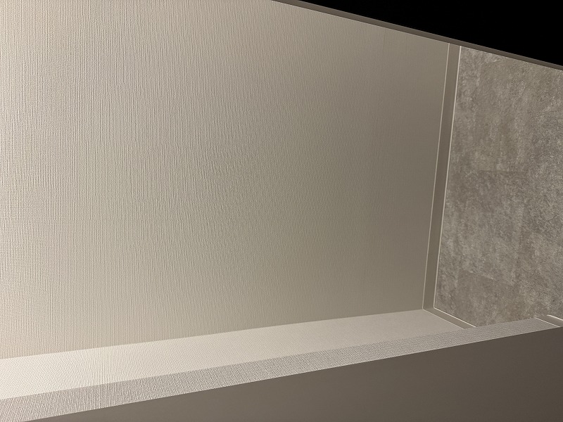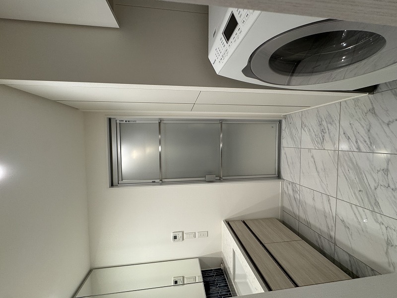 バスルーム…浴槽形状をクレイドル型に変更/浴室ガラス不透明に変更/浴室収納棚