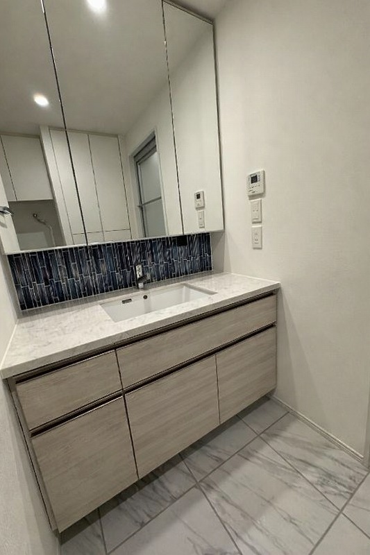 洗面室…洗面化粧台カウンターグレードアップ(フィオレストーン)/三面鏡下モザイクタイルにグレードアップ/床タイルに変更